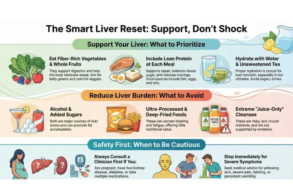 Start with the basics: reduce alcohol, added sugars, and ultra-processed foods; increase fiber-rich vegetables; prioritize hydration and sleep. These steps support the liver’s normal detox pathways without forcing the body into stress.